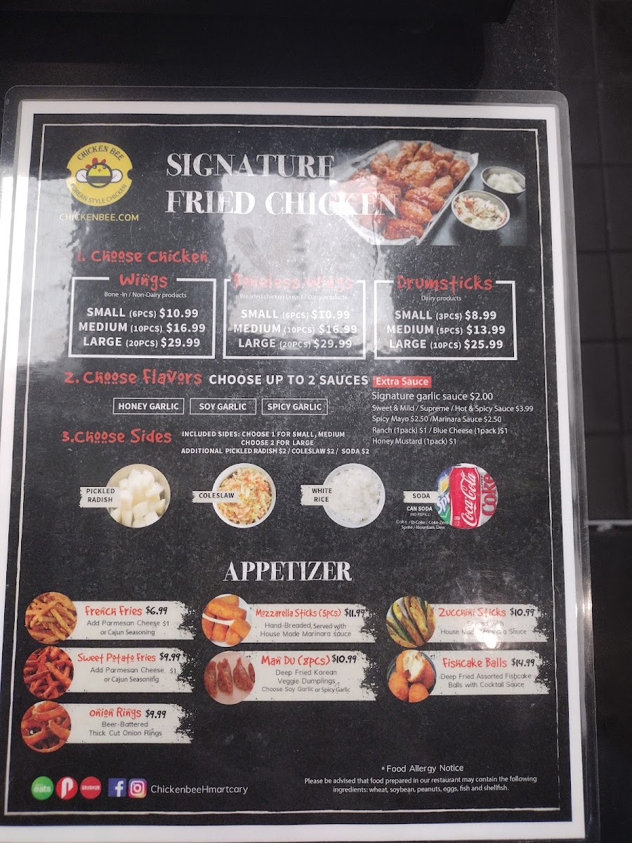 Welcome to Chicken Bee, a delightful culinary gem located at 1961 High House Rd in Cary, NC. This restaurant specializes in mouthwatering Korean fried chicken, renowned for its crispy texture and flavorful sauces. Guests rave about the Signature Fried Chicken, particularly the Soy Garlic and Honey Garlic varieties, which deliver a perfect balance of crunch and juiciness. Each dish is accompanied by tantalizing sides like Chicken Fried Rice and Onion Rings, enhancing the overall experience.